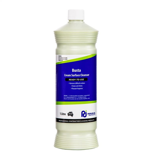 Peerless Busta Cream Surface Cleaner 1L is a powerful commercial-grade cream cleanser that effectively removes grime while polishing a wide range of surfaces