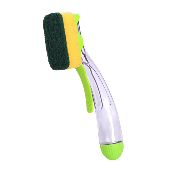 The durable sponge head includes tough bristles to cut through grime while remaining safe for everyday dishwashing