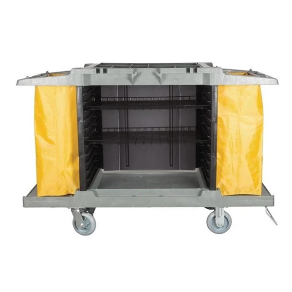 is a commercial-grade housekeeping cart suited for hotel, hospitality and institutional cleaning service rounds