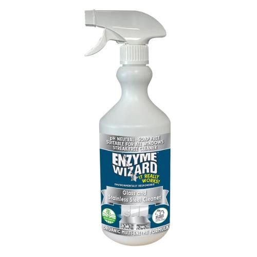 The Enzyme Wizard Glass and Stainless Steel Cleaner contains a proprietary blend of enzymes and surfactants which breaks down dirt, oils, grease and other organic material, leaving glass and stainless steel clean and streak-free