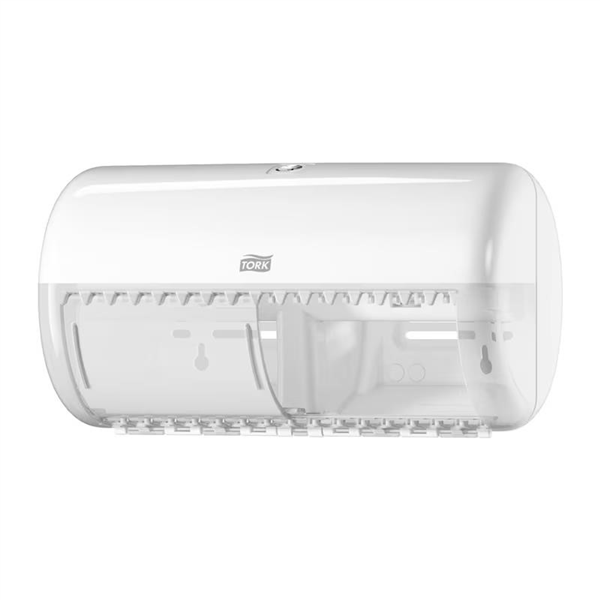 This dispenser holds two conventional toilet rolls, reducing the risk of run-outs while minimizing maintenance time