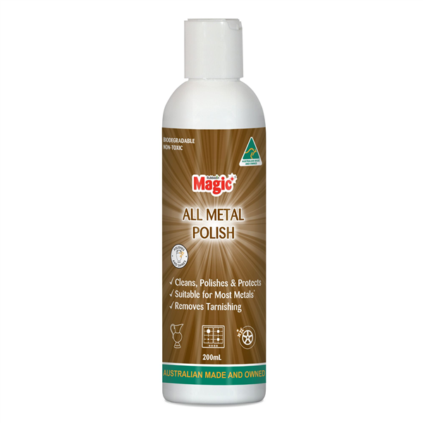 Magic All Metal Polish 200 mL is a 3-in-1 formula that cleans, polishes and protects most metal surfaces, restoring shine and brilliance