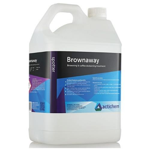 Brownaway is a browning remover for carpets and upholstery. Brownaway is an innovative, high activity formula for neutralising & reversing alkaline browning (cellulosic browning) stains. This professionally researched formula includes a special blend of low pH compounds proven to permanently remove tough browning discolourations, water marks, coffee stains, urine stains and many dye stains. Size: 5L