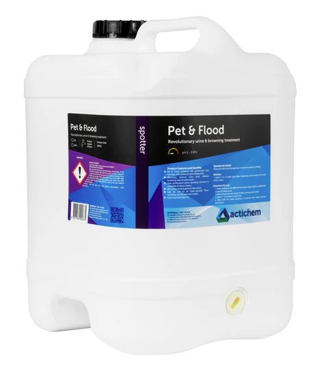 Actichem Pet & Flood Antimicrobial is a unique, low-pH spotting solution designed for high-performance removal of cellulosic browning, urine stains, and their associated odours