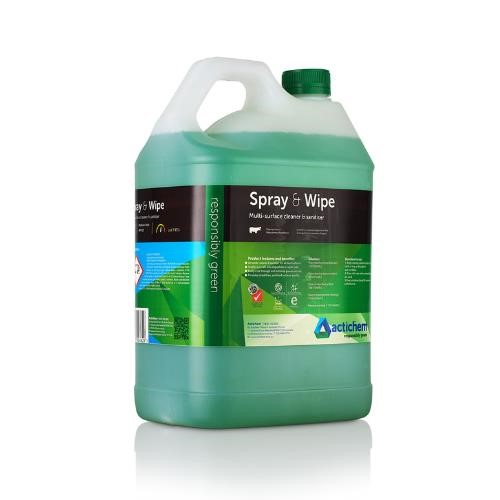 PRODUCT DESCRIPTION. Make everyday cleaning more powerful and sustainable with Actichem Spray N Wipe GECA 5L, an eco-friendly multi-surface cleaner enhanced with advanced Elimotech™ technology. This innovative formula goes beyond surface-level cleaning by continuing to break down grime, bacteria, and odours even after application, delivering long-lasting freshness and hygiene. Crafted with biodegradable, septic-safe surfactants, Spray N Wipe GECA is safe for daily use on benchtops, tiles, walls, and floors in kitchens, bathrooms, schools, offices, and commercial spaces. Its anti-resoiling action keeps surfaces cleaner for longer, making it the ideal go-to cleaner for high-traffic environments