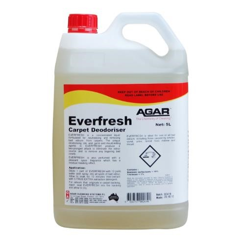 Agar Everfresh is a concentrated liquid formulated to neutralise and remove unpleasant odours from carpets caused by smoke, urine, vomit, perspiration, spoiled food, mildew, and mould.