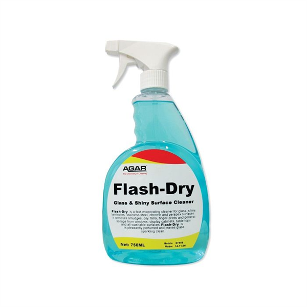 FOR USE ON. Flash Dry will remove smudges, oily films, fingerprints and general soilage from glass, shiny laminates, stainless steel, chrome and perspex surfaces. It is ideal for cleaning windows, tinted glass, mirrors, display cabinets, tabletops, benches, poker machines, car, truck and bus windscreens, and a wide variety of other shiny, hard surfaces