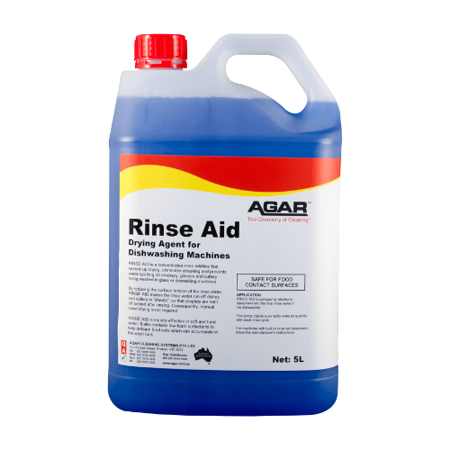 PRODUCT DESCRIPTION. Agar Rinse Aid 5L is a premium liquid rinse additive formulated to deliver spotless, streak-free drying in commercial dishwashing machines. Designed for use in the final rinse cycle, this high-performance solution reduces water spotting, promotes rapid drying, and ensures dishes, glassware, and utensils are left sparkling clean. Ideal for restaurants, cafés, catering kitchens, hospitals, and institutional dishwashing operations