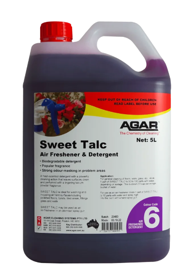 Dual-action deodoriser and detergent with a soft, powdery “sweet talc” fragrance designed to freshen and clean indoor environments