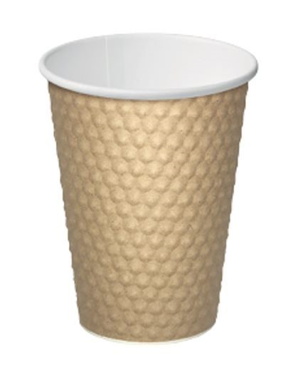 Brown Dimple Paper Hot Cup. with insulating air pockets. Brown. Size: 12oz. 355mL. Qty: 25 per sleeve. 500 per carton. Item: CA-DMPL12-BRN.
