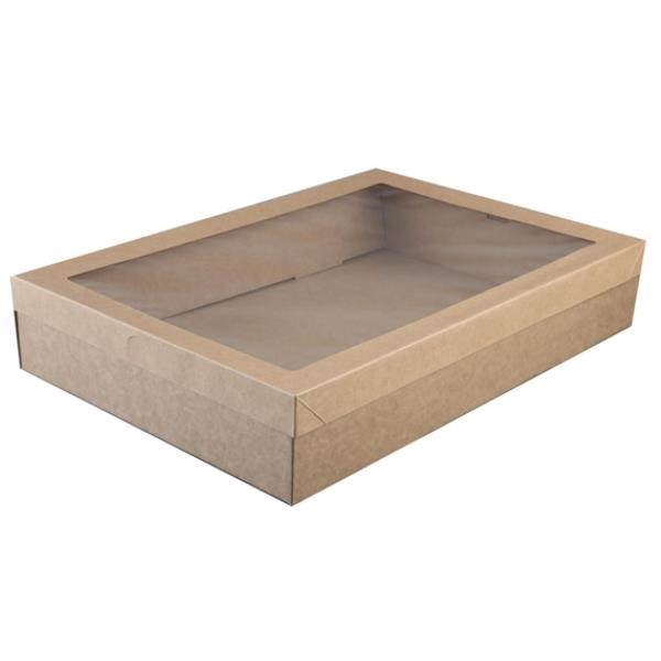 Made from brown kraft paper with a clear plastic window, these catering boxes are not only environmentally friendly but also stylish and sleek looking. Able to transport most types of food such as bread, pastries, fruit or cheese. Size: 450mm X 310mm X 80mm. Colour: Kraft/Brown. Quantity: 50 Cater Boxes per carton