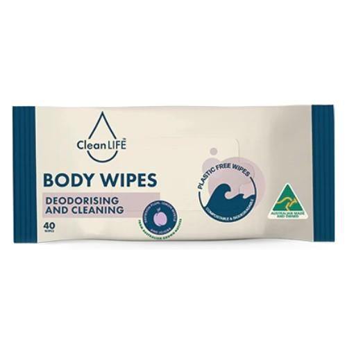 Clean Life Body Wipes. Clean Life body wipes are deodorising wipes for when the body need a refreshing uplift. Ideal after exercise, work, or travel, these cleansing wipes use native Davidson Plum, Lemon Myrtle and Jojoba to create a gentle non-irritating fresh clean. Free of soap, parabens, perfume and phthalates. Deodorising body parts. For sweaty bodies when unable to shower. Naturally gentle and non-irritating, Jojoba enhanced. Quantity: 40 Wipes Per Pack