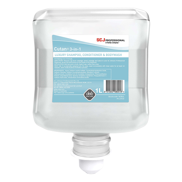 Cutan 3-in-1 Shower Care is a luxury Shampoo, Conditioner and Body wash in one. It is specifically developed for quick and easy application, with conditioning agents to leave the hair and body feeling soft and smooth. It has a light fragrance and easily lathers and rinses off, leaving the skin feeling refreshed. Size: 1L. Quantity: 6 Pods Per Carton