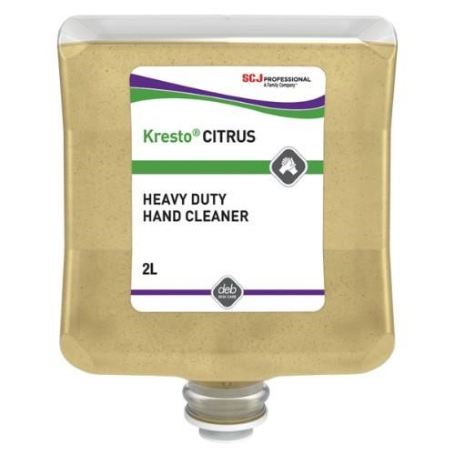 PRODUCT DESCRIPTION. Deb Kresto Citrus 2L is a powerful industrial hand cleanser formulated with natural cornmeal scrubbing agents and refreshing citrus extracts to deliver highly effective cleaning performance. Designed to tackle deeply ingrained and difficult-to-remove soilings such as tar, inks, bitumen, adhesives, most oil-based paints, oil, grease, and grime, it works quickly to cut through soils and make hand washing faster and easier. The non-abrasive cornmeal scrubbers provide a deep clean while being gentle on skin and are easily rinsed away to prevent blocked drains and pipes. This solvent-free, skin-friendly formula leaves hands feeling smooth, clean, and refreshed, even after frequent use