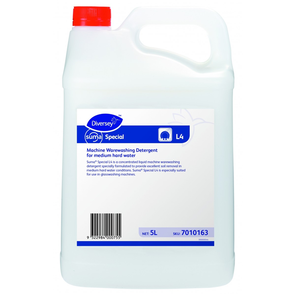 Diversey Suma Special L4 is a highly alkaline liquid detergent formulated for machine dishwashing in hard water conditions.