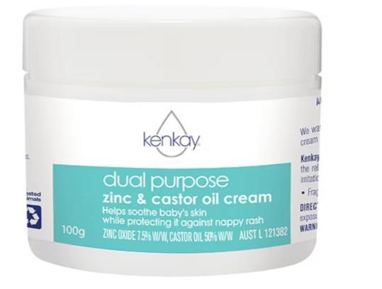 Kenkay Dual Purpose Zinc & Castor Oil Cream is a soothing and protective cream used for the relief of the symptoms of nappy rash, mild eczema, dermatitis, and minor skin irritations. This dual purpose cream is also water repellent. Fragrance free. Lanolin free. Peanut oil free. Size: 100g