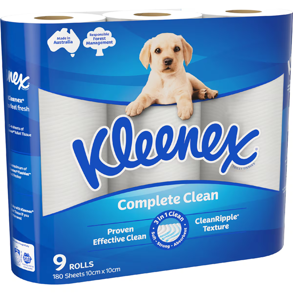 PRODUCT DESCRIPTION. Kleenex Toilet Paper 180 Sheet 9/Pk delivers a premium bathroom experience with its 3-in-1 clean design that is soft, strong, and highly absorbent. Each extra-thick sheet features the signature CleanRipple texture, providing a superior clean while being gentle on the skin. This pack contains 9 rolls, each with 180 sheets measuring 10cm x 10cm, offering both comfort and quality in every roll