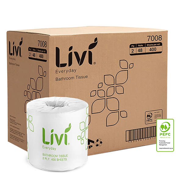 PRODUCT DESCRIPTION. Livi Toilet Tissue Everyday 2Ply 400 Sheet 48/CTN is a reliable and comfortable toilet paper choice for daily use in both commercial and residential settings. Each roll features 400 sheets of soft, strong, and absorbent 2-ply tissue, individually wrapped to ensure optimal hygiene. With dimensions of 99mm (W) x 110mm (L) per sheet, these conventional rolls are designed for everyday convenience and compatibility with standard toilet roll holders. Supplied in a bulk carton of 48 rolls, it’s an economical solution for maintaining a consistent bathroom supply