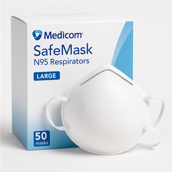 Medicom SafeMask N95 Disposable Face Mask (Large, 50 Pack) provide advanced respiratory protection designed to filter out airborne particles, including dust, droplets, and microorganisms