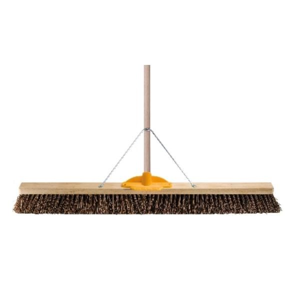 is a durable, high-performance broom designed for commercial and industrial sweeping. It features tough natural bassine bristles ideal for collecting heavy dust and debris on rough or dry surfaces. The broom comes complete with a 1.80m x 25mm plain timber handle, offering a strong and comfortable grip during use. Reinforced with a sturdy metal bracket, it provides extra strength and long-lasting reliability under heavy workloads. With its extra-wide 900mm head, this broom is perfect for cleaning large floor areas quickly and efficiently