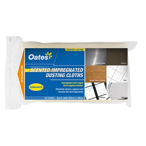 Oates Dust Cloth Impregnated 25/PK 165407 is a disposable dusting cloth designed to effectively capture and hold dust on surfaces.