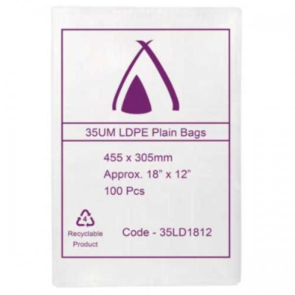 The Poly Bag 18x12" (455x305mm) 35µm is a strong, clear plastic bag designed for packaging, storage, and protection of larger items.