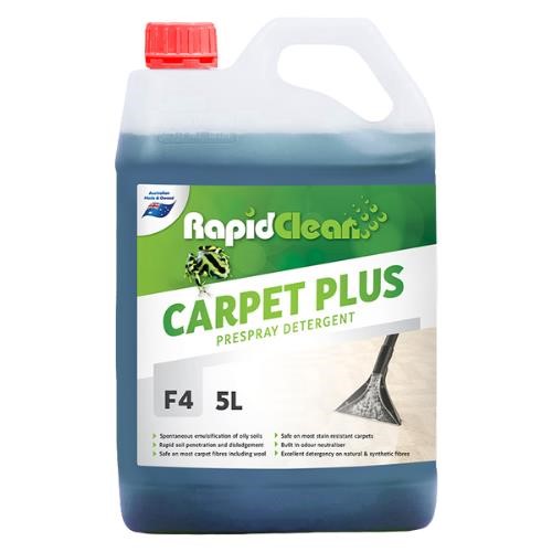 RapidClean Carpet Plus is an all-in-one carpet cleaning solution that doubles as an extraction detergent, pre-spotter, odour suppressor, and deodoriser