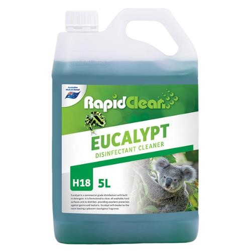 Rapid Clean Eucalypt Disinfectant is a commercial grade disinfectant with built in detergent. It is formulated to clean all washable hard surfaces and to disinfect, providing excellent protection against germs and bacteria. Eucalypt will also work as a room deodoriser. Eucalypt is safe for use on all washable hard surfaces and will deodorise the room leaving a pleasant eucalyptus smell. Available in 5L and 15L