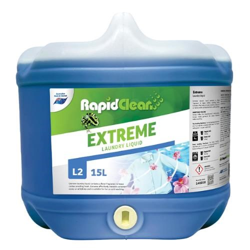RapidClean Extreme Concentrated Laundry Liquid contains a floral fragrance to leave clothes smelling fresh. Extreme Concentrated Laundry Liquid effectively removes common stains on all fabrics and is suitable for hot or cold washing. Extreme is Grey Water safe and complies with Australian standards for phosphate content. Extreme is a clear, thick blue liquid combining a blend of powerful cleaning agents, detergents and specialty optical brighteners. EXTREME ensures maximum cleaning performance on all soils encountered leaving fabrics clean and bright with a fresh residual fragrance. Extreme can be used in all types of washing machines, front and top loading to remove a wide range of household stains including grease, fat, blood, oil, dirt and perspiration. Extreme is also suitable in industrial washing machines for use in on premise laundries such as nursing homes, motels and hotels. Available in 5L and 15L