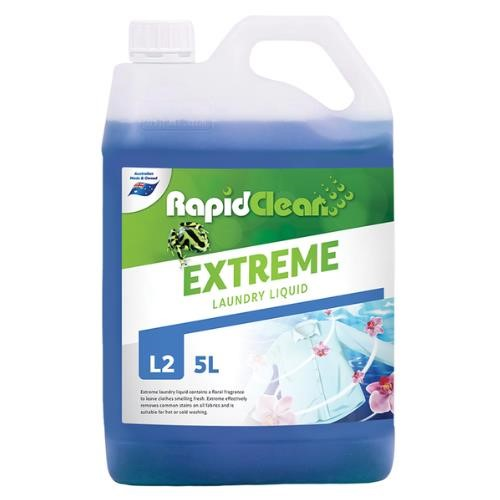 RapidClean Extreme Concentrated Laundry Liquid contains a floral fragrance to leave clothes smelling fresh. Extreme Concentrated Laundry Liquid effectively removes common stains on all fabrics and is suitable for hot or cold washing. Extreme is Grey Water safe and complies with Australian standards for phosphate content. Extreme is a clear, thick blue liquid combining a blend of powerful cleaning agents, detergents and specialty optical brighteners. EXTREME ensures maximum cleaning performance on all soils encountered leaving fabrics clean and bright with a fresh residual fragrance. Extreme can be used in all types of washing machines, front and top loading to remove a wide range of household stains including grease, fat, blood, oil, dirt and perspiration. Extreme is also suitable in industrial washing machines for use in on premise laundries such as nursing homes, motels and hotels. Available in 5L and 15L