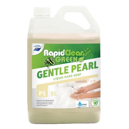 . RapidClean Gentle Pearl Liquid Hand Soap is a creamy lotion with a pleasant rose fragrance. It combines mild detergents with unique moisturising and conditioning agents. Gentle has been designed as a hand cleaner. Gentle is suitable for all amenities such as toilets, change rooms and showers, as well as retail outlets such as hair dressing salons. GENTLE can also be applied through most liquid soap dispensers. Available in 5L and 15L