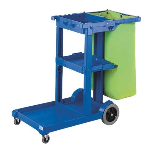 is a sturdy, multi-purpose cleaning trolley designed to organise supplies, tools and waste for professional cleaning teams.