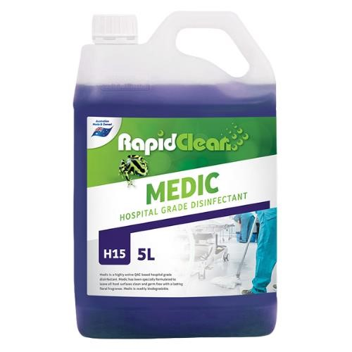 RapidClean Medic Hospital Grade Disinfectant is a clear blue coloured liquid that contains a combination of cleaning agents and highly effective quaternary sanitisers plus a long lasting floral fragrance.