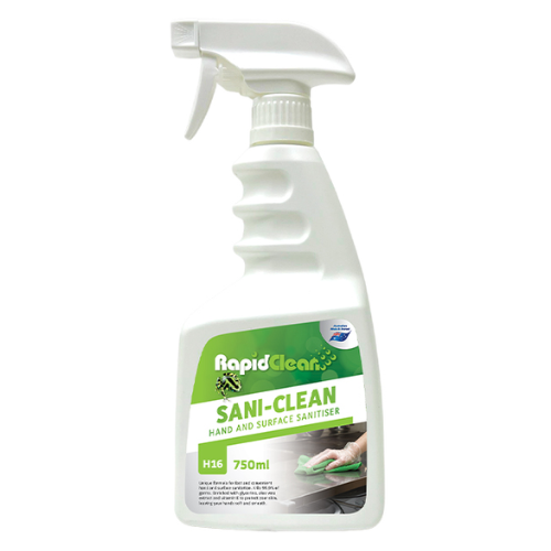 RapidClean Sani-Clean Hand and Surface Sanitiser 750ml is a ready-to-use alcohol-based sanitiser formulated for quick and effective disinfection of hands and hard surfaces.