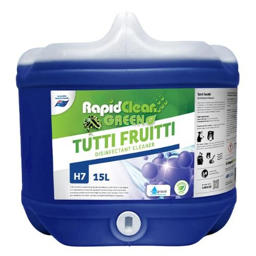 RapidClean Tutti Fruitti Disinfectant is a blue coloured liquid that contains a combination of cleaning agents and highly effective quaternary sanitisers plus a long lasting bubble gum residual perfume