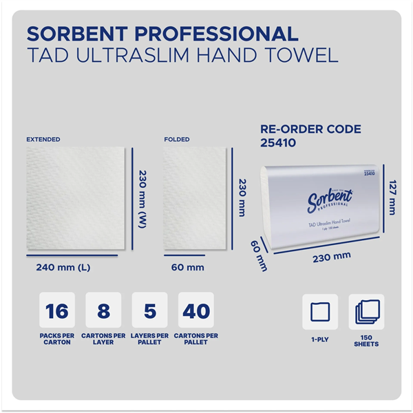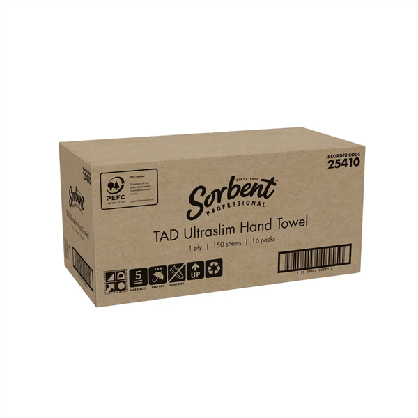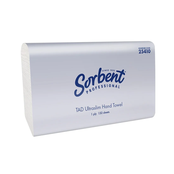 PRODUCT DESCRIPTION. Sorbent Hand Towel Ultraslim 2400/CTN delivers exceptional absorbency and strength with premium TAD (Through-Air-Dried) technology, making it ultra-strong whether wet or dry. Crafted with interlocking fibres that form a sponge-like structure, these towels provide maximum absorption with every use. Each sheet measures 240mm x 230mm, designed to fit seamlessly into Sorbent 25506 dispensers for reliable and hygienic dispensing. With 150 sheets per pack and 16 packs per carton (2400 sheets total), they are an efficient and cost-effective solution for busy facilities