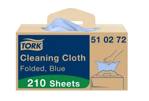 • Tork Cleaning Cloth Blue Folded 210/CTN Code 510272 is a versatile, disposable cleaning cloth designed for efficient wiping and surface cleaning tasks.
