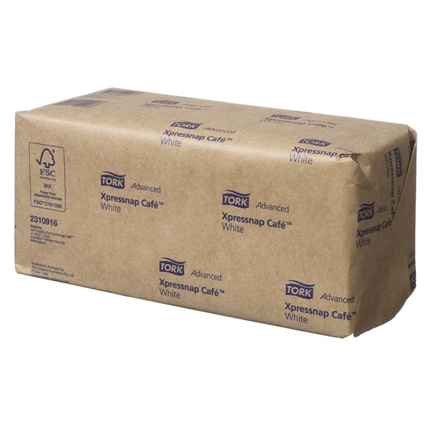 Tork Napkin Xpressnap Cafe N10 Natural. 1 Ply. Folded Length: 10.8cm(L) x 10.8cm(W). Unfolded Length: 21.6cm(L) x 21.6cm(W). Colour: White. Code: 2310916. Suits Tork Dispenser 273003, 274003, 2307947. Size: 500 Per Pack. Quantity: 12 Packs Per Carton