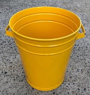 The bin is finished with a thick, hardened yellow powder coating for superior rust and corrosion resistance, while the outward-facing handles allow for easy gripping, lifting, and emptying